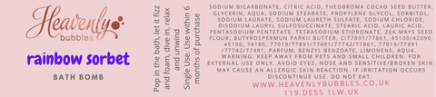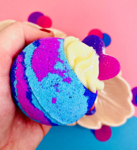 The Bath Bomb: ♡ Rainbow Sorbet Bath Bomb ♡ Purple, pink and blue ♡ Shea and cocoa butters to moisturise & soothe your skin ♡ Cocoa butter frosting topping with a veggie glycerin soap heart to wash with ♡ Scented: Fresh lime, pineapple, orange, and raspberry, with creamy base notes of vanilla ♡ 6cm diameter approx ♡ Veggie ♡ Wrapped in bio / recyclable shrink wrap