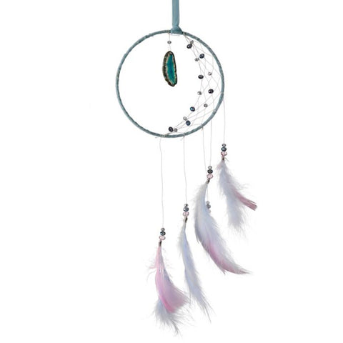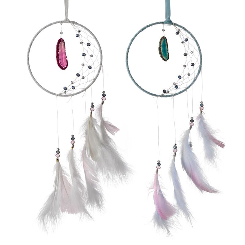 A striking crescent-moon dreamcatcher in soft white tones, finished with delicate feathers and a real agate charm. Designed to bring a calming, spiritual feel to bedrooms, meditation corners or cosy reading spaces. The detailed weaving and gentle movement make it both beautiful décor and a meaningful gift.
